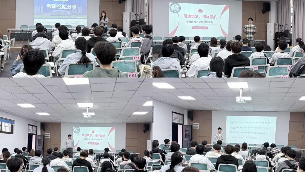 活动现场氛围热烈浓厚,掌声此起彼伏。22级考研优秀学子何宇焱、刘康哲、刘诗琪、刘宇郴依次登台,结合自身备考的亲身经历,向在场学弟学妹倾囊相授考研心得。四位学子围绕院校选择的科学考量、各备考阶段的规划与落地、公共课与专业课的精准备考策略、备考期间的心态疏导方法,以及复试流程、应答技巧等核心要点,毫无保留地分享实用经验。他们真诚讲述了备考路上的迷茫与坚守、艰辛与收获,耐心细致地解答了在场同学关于复习节奏把控、备考资料筛选、时间合理分配等方面的疑问,用自身的奋斗经历传递青春正能量,为备考学子注入强大动力,让在场每一位同学都深受启发、倍感振奋,更加坚定了考研的决心与信心。
